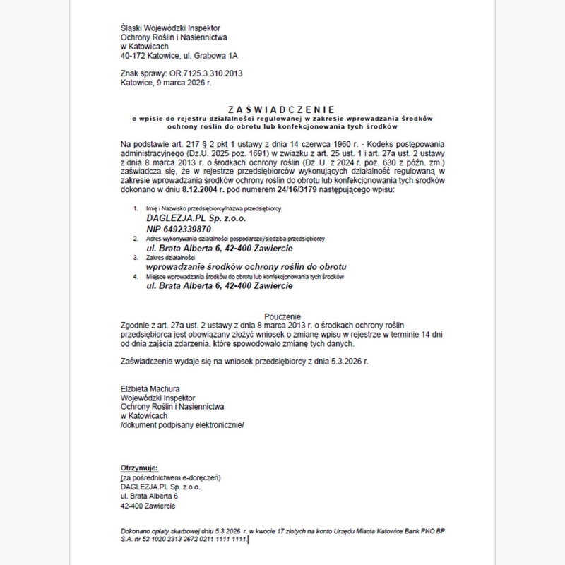 Zaświadczenie o wpisie do rejestru działalności regulowanej w zakresie j wprowadzenia środków ochrony roślin do obrotu lub konfekcjonowania tych środków